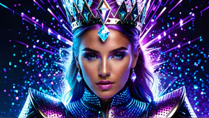 Betoverende fantasy portretfoto in neonkleuren blauw en paars. De compositie toont een adembenemende kroon met kristallen, gecombineerd met bijpassende juwelen en een futuristisch kostuum. De dramatische belichting en speciale effecten creëren een magische sfeer perfect voor moderne mode- en kunstfotografie.