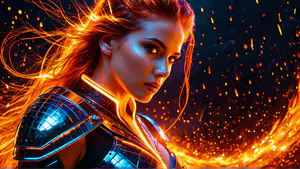 Spectaculaire digitale kunstfoto met dramatische contrasten tussen warm oranje vuureffecten en koele blauwe neonverlichting. Het futuristische kostuum met metallic details en de dynamische vonkenregen creëren een meeslepende cyberpunk sfeer. perfect voor gaming artwork, boekomslagen of moderne marketingcampagnes.