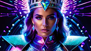 Artistiek portret in futuristische stijl met opvallende neonverlichting in paars en blauw. De compositie wordt gekenmerkt door een kristallen kroon, geometrische accessoires en een spiegelende kraag met holografische effecten. perfect voor moderne mode-concepten, beauty campagnes of fantasy projecten.