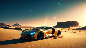 Een luxueuze gouden hypercar met opvallende blauwe LED-accenten baant zich een weg door gouden zandduinen tijdens een spectaculaire zonsondergang. De rotsformaties en de vallende ster aan de hemelsblauwe horizon creëren een adembenemend sci-fi landschap.