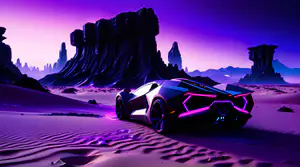 Een gestroomlijnde zwarte hypercar met opvallende neonroze accenten, gezien vanaf de achterkant, staat in een mysterieus buitenaards woestijnlandschap. De hoekige carrosserie reflecteert het paarse licht dat de hele omgeving baadt in een surreële gloed. Op de achtergrond rijzen imposante alien rotsformaties op tegen een dramatische paarse hemel, wat een perfecte retrofuturistische sfeer creëert.