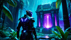 Adembenemende digitale kunstscène van een gepantserde figuur in een verlicht cyberpunk kostuum, staand voor een oude tempel met een paars gloeiend portaal. De tropische setting wordt gedomineerd door turquoise verlichting, weelderige palmbladeren en mysterieuze ruïnes, perfect voor gaming en sci-fi concepten.