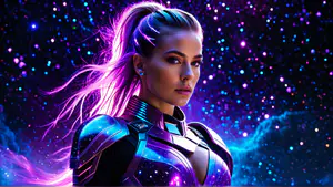 Spectaculaire digitale kunstafbeelding in cyberpunk stijl met neon accenten. Het futuristische harnas reflecteert het kosmische licht tegen een achtergrond van sprankelende sterren. De combinatie van diep paars en elektrisch blauw creëert een meeslepende sci-fi sfeer perfect voor gaming of moderne wanddecoratie.