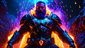 Indrukwekkende digitale kunstwerk van een futuristische krijger in een high-tech gevechtsharnas, omringd door spectaculaire neon lichteffecten in blauw en oranje. Het dramatische contrast tussen de donkere achtergrond en de felle kleuren creëert een meeslepende sciencefiction sfeer die perfect past bij gaming en moderne fantasiekunst.