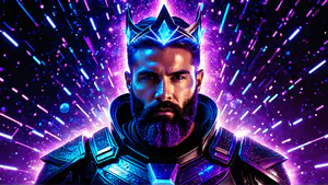 Spectaculaire digitale kunstwerk van een futuristische krijger in neonverlichte bepantsering. De dramatische compositie wordt versterkt door kosmische effecten in levendige paarse en blauwe tinten. Een mystieke kroon en high-tech harnas creëren een meeslepende science fiction sfeer, perfect voor gaming of entertainment projecten.