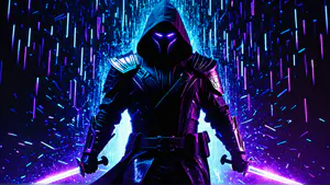 Dramatische digitale illustratie van een mysterieuze krijger in zwart gevechtsharnas, verlicht door intense neonkleuren blauw en paars. De figuur draagt een capuchon met lichtgevende ogen en houdt twee energiezwaarden vast tegen een achtergrond van vallende lichtstralen, perfect voor gaming of sci-fi ontwerpen.