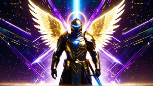 Indrukwekkende digitale illustratie van een gepantserde krijger met gloeiende gouden vleugels tegen een kosmische achtergrond. Het beeld straalt kracht en mystiek uit door het contrast tussen het donkere harnas, de lichtgevende elementen en de paarse sterrennevel. perfect voor gaming-gerelateerde projecten of fantasy artwork.