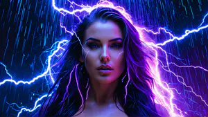 Artistiek portret in cyberpunk-stijl met dramatische neonverlichting en elektrische bliksemeffecten. De combinatie van paarse en blauwe tinten creëert een mysterieuze, futuristische sfeer. De regenachtige achtergrond en lichtflitsen versterken de dramatische uitstraling van deze professionele studiofoto.