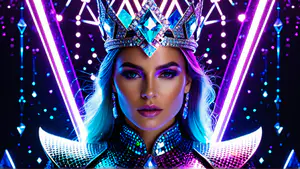 Betoverende futuristische compositie met neonverlichting in paars en blauw. De kristallen kroon en glinsterende edelstenen creëren een luxueuze cyberpunk sfeer. perfect voor moderne mode-concepten, nachtclub promotie of futuristische ontwerpen. De dramatische belichting en rijke kleuren maken deze afbeelding bijzonder opvallend.