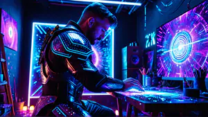 Sfeervolle studio-opname met opvallende neonverlichting in blauw en paars. Het futuristische cyberpunk kostuum met LED-details staat centraal tegen een achtergrond van digitale kunstwerken en lichteffecten. perfect voor gaming content, technologie-concepten of moderne entertainmentproducties.