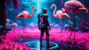 Betoverende digitale kunstscène waarin een futuristische figuur in hightech pak wordt omringd door felroze flamingo's in een neon verlicht tropisch paradijs. De combinatie van cyberpunk-elementen met natuurlijke schoonheid creëert een surrealistisch tafereel, perfect voor moderne ontwerpen en science fiction thema's.