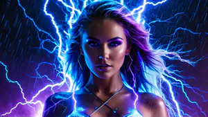 Dramatische studiofoto met spectaculaire neon lichteffecten en bliksemschichten tegen een donkere achtergrond. De intense blauwe en paarse kleuren creëren een futuristische sfeer, terwijl regendruppels en elektrische effecten voor extra spanning zorgen. perfect voor moderne marketingcampagnes of artistieke projecten.