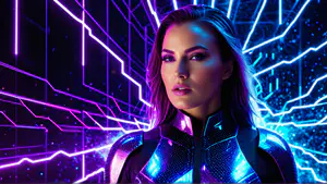 Stijlvolle portretfoto met dramatische neonverlichting in paars en blauw. Het futuristische kostuum met glinsterende details wordt geaccentueerd door geometrische lichtlijnen op de achtergrond. perfect voor moderne marketingcampagnes, tech-gerelateerde projecten of cyberpunk-geïnspireerde ontwerpen.