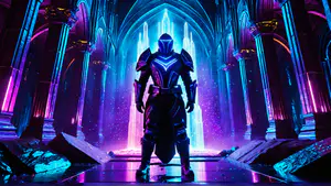 Imposante digitale kunstwerk van een mysterieuze ridder in futuristische wapenrusting, staand in een gotische kathedraal verlicht door neon blauw en paars licht. De architecturale bogen en zuilen creëren een dramatisch perspectief, terwijl glinsterende deeltjes door de lucht zweven. perfect voor gaming-concepten of fantasy illustraties.