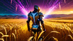 Indrukwekkende digitale kunst van een geavanceerd robotharnas met neonblauwe accenten, staand in een goudgeel graanveld tijdens een dramatische zonsondergang. De paarse lichtstralen aan de hemel creëren een surrealistisch sciencefiction tafereel dat technologie en natuur op unieke wijze samenbrengt.