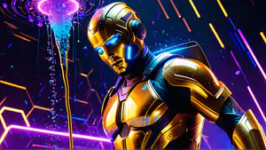 Indrukwekkende digitale illustratie van een geavanceerde robot in glanzend gouden pantser, omgeven door levendige neonkleuren en lichteffecten. Het dramatische ontwerp combineert cyberpunk-elementen met futuristische details tegen een donkere achtergrond met paarse en blauwe accenten. perfect voor moderne technologie-gerelateerde projecten en sc...
