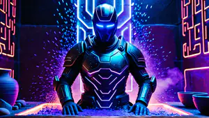 Indrukwekkende cyberpunk compositie met een high-tech robot in glanzend pantser, verlicht door intense neonblauwe en paarse tinten. De dramatische belichting en futuristische details creëren een mysterieuze sciencefiction sfeer, perfect voor gaming of tech-gerelateerde projecten. De gedetailleerde 3D-rendering toont geavanceerde technologie in e...