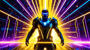 Indrukwekkende futuristische compositie van een robotachtig figuur in glanzend zwart pantser met blauwe accenten, gecentreerd tegen een explosie van gouden lichtstralen. De achtergrond wordt gedomineerd door neon kleuren en geometrische patronen die een hypermoderne cyberpunk sfeer creëren. perfect voor gaming, tech of sci-fi projecten.