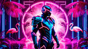 Spectaculaire digitale kunstwerk van een futuristische robot in glanzend blauw pantser, geplaatst tegen een neon roze achtergrond met tropische elementen. De scène wordt gedomineerd door een verlichte cirkel, neon palmbomen en felroze flamingo's, perfect voor moderne gaming- of technologie-gerelateerde projecten.