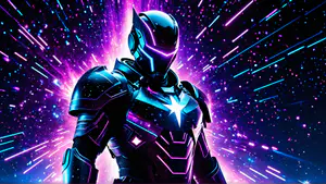 Indrukwekkende digitale illustratie van een gepantserde robot in een kosmisch landschap. De combinatie van elektrisch blauw en neonpaars creëert een mysterieuze sfeer, terwijl lichtstralen en sterren op de achtergrond een dynamisch effect geven. perfect voor gaming-gerelateerde projecten of futuristische ontwerpen.