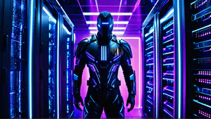 Imposante robotachtige figuur in een hypermodern datacentrum, omringd door servers en neonverlichting in paarse en blauwe tinten. De dramatische belichting en futuristische vormgeving creëren een cyberpunk atmosfeer die perfect past bij moderne tech-presentaties, gaming concepten of artikelen over kunstmatige intelligentie.