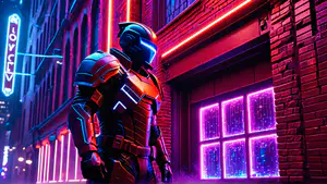 Imposante robotfiguur in glanzend rood-zwart pantser tegen een stedelijke achtergrond badend in neonlicht. De sfeervolle setting wordt gekenmerkt door paarse en blauwe neonverlichting, verlichte ramen en bakstenen muren. perfect voor moderne gaming- en technologie-gerelateerde projecten of cyberpunk-geïnspireerde ontwerpen.