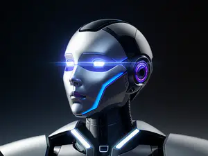 Een futuristische robot met verlichte ogen, perfect voor gebruik in technologie- en innovatieprojecten. Ideaal voor presentaties over kunstmatige intelligentie en de digitale toekomst. Ontdek de mogelijkheden van geavanceerde technologie.