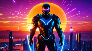 Imposante futuristische robotfiguur in glanzend pantser met neonblauwe accenten, gesilhouetteerd tegen een dramatische oranje zonsondergang. De achtergrond toont een cyberpunk stadsgezicht met hoge torens en paarse lichtstralen. perfect voor gaming artwork, sci-fi projecten of moderne technologie concepten.