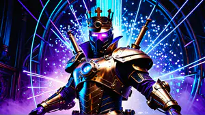Indrukwekkende robotfiguur in koninklijk harnas, verlicht door intense neon blauwe en paarse lichtstralen. Het mechanische wezen draagt een machtige kroon en is uitgerust met geavanceerde technologie, perfect voor gaming- en sciencefiction-concepten. De dramatische belichting en futuristische setting creëren een meeslepende cyberpunk sfeer.
