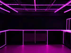 Strakke, minimalistische ruimte met opvallende paarse LED-strips die de contouren accentueren. perfect voor een moderne club, expositieruimte of evenementenlocatie. De futuristische sfeerverlichting creëert een high-tech ambiance met een mysterieuze uitstraling. De zwarte wanden versterken het dramatische effect van de neonverlichting.