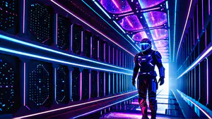Spectaculaire futuristische corridor met dynamische neonverlichting in blauw en paars. Een ruimtepak-figuur loopt door een high-tech gang met reflecterende vloeren en geometrische wandpanelen. De dramatische verlichting en het perspectief creëren een meeslepende cyberpunk sfeer, perfect voor gaming of sci-fi concepten.