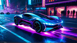 Adembenemende visualisatie van een hypermoderne sportwagen in een levendige cyberpunk setting. De auto's strakke lijnen worden geaccentueerd door intense neonverlichting in blauw en paars, die reflecteert op het natte wegdek. De futuristische cityscape op de achtergrond creëert een meeslepende sfeer die doet denken aan een wereld van morgen.