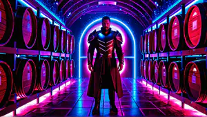 Spectaculaire wijnkelder met een futuristische uitstraling, verlicht door neon en LED in paarse en blauwe tinten. De symmetrische opstelling van traditionele wijnvaten contrasteert prachtig met de moderne lichteffecten. Een unieke mix van klassieke wijnopslag en cyberpunk aesthetiek, perfect voor evenementen of moderne horeca-concepten.