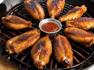 Sappige kippenvleugels met een glanzende, karamelachtige glazuur, perfect gegrild op een zwart barbecuerooster. De vleugels zijn in een stervorm gerangschikt rond een pittige dipsaus. Het gerecht combineert een knapperige buitenkant met malse binnenkant, ideaal voor borrels of casual diners.