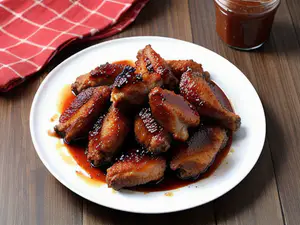 Sappige, krokant gegrilde kippenvleugels overgoten met een glanzende laag zoete barbecuesaus. perfect als borrelsnack of hoofdgerecht geserveerd op een wit bord met een klassiek rood-wit geblokt servet. De rijke, donkere saus zorgt voor een verleidelijke glans en belooft een intense smaakbeleving.