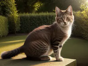 Stijlvolle opname van een elegante gestreepte kat in een verzorgde tuin tijdens het gouden uurtje. De kat zit alert op een muurtje met op de achtergrond een strakke groene heg. Het warme avondlicht creëert een sfeervolle gloed die perfect past bij de rustige tuinsetting.