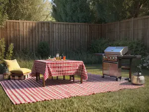 Sfeervolle tuinopstelling voor een perfecte barbecue-avond. Het klassieke rood-witte geruite picknickkleed creëert een knusse eethoek, compleet met een moderne RVS gasbarbecue. De comfortabele loungeplek met geel kussen en sfeervolle lantaarns maken het plaatje compleet voor een ontspannen buitenmaaltijd.