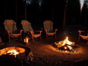 Sfeervol verlichte kampeerplek in een bosrijke omgeving tijdens de avondschemering. Twee brandende vuurplaatsen zorgen voor warmte en gezelligheid, omringd door comfortabele vouwstoelen in oranje-grijs design. perfect voor natuurliefhebbers die willen genieten van authentieke kampeersfeer met modern comfort.