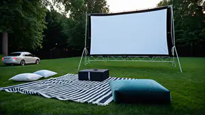 Sfeervolle buitenbioscoop setup met groot projectiescherm in een groene tuin tijdens de schemering. Complete opstelling met gestreept picknickkleed, comfortabele kussens en een compacte projector. perfect voor een ontspannen filmavond onder de sterrenhemel of een uniek tuinfeest met vrienden en familie.