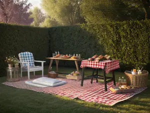 Sfeervolle picknickopstelling in een verzorgde tuin met klassiek roodwit geblokt kleed en comfortabele tuinstoel. De setting wordt compleet gemaakt door verse broodjes, een rieten mand en decoratieve accessoires. perfect voor een ontspannen lunch of borrel in de buitenlucht, omringd door strakke groene hagen.