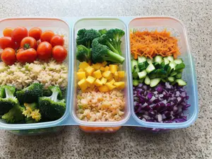 Praktische maaltijdvoorbereiding met verse ingrediënten in handige bewaarbakjes. perfect voor een gezonde lunch of diner doordeweeks. De bakjes bevatten een kleurrijke mix van kerstomaatjes, broccoli, quinoa, geraspte wortel, komkommer en rode ui. Ideaal voor bewust eten en tijdsbesparing.