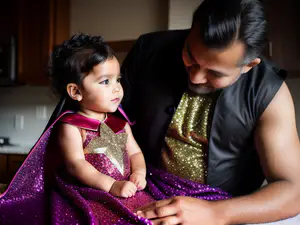 Hartverwarmend moment met een schitterend paars-gouden superheldenkostuum met glitters en sterren. De cape en het pak zijn gemaakt van luxe glanzende stof die perfect past bij feestelijke gelegenheden zoals carnaval of themafeesten. Het ontwerp combineert speelse elementen met een stijlvolle uitstraling.