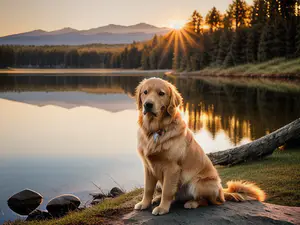 Sfeervolle natuurfoto van een Golden Retriever die poseert bij een spiegelglad bergmeer tijdens zonsondergang. Het warme avondlicht schijnt door de dennenbomen en wordt prachtig weerspiegeld in het water, terwijl de majestueuze bergen op de achtergrond voor een adembenemend decor zorgen.