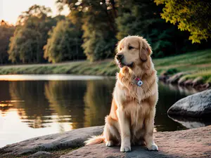 Prachtige Golden Retriever zit majestueus op een rots bij een rustig meer tijdens zonsondergang. De warme avondzon geeft de vacht een gouden gloed, terwijl op de achtergrond een weelderig boslandschap te zien is. perfect vastgelegd moment van rust en natuurlijke schoonheid, ideaal voor dieren- en natuurthema's.