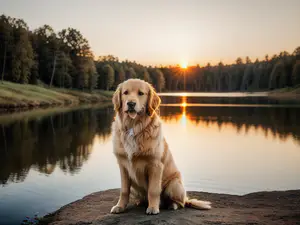 Sfeervolle natuurfoto van een prachtige Golden Retriever die majestueus poseert aan de oever van een rustig bosmeertje tijdens zonsondergang. Het warme avondlicht en de perfecte spiegeling in het water creëren een betoverende sfeer. Ideaal voor thema's rond huisdieren, natuur en ontspanning.