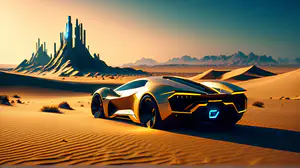 Een luxueuze gouden hypercar met scherpe hoekige vormen en subtiele blauwe accenten baant zich een weg door gouden zandduinen in een buitenaards woestijnlandschap. Op de achtergrond rijst een indrukwekkende rotsformatie op die doet denken aan een futuristische stad of citadel. De warme zonsondergangshemel creëert een dramatisch contrast met de koele blauwtinten van de auto en de verre bergen, terwijl de ribbels in het zand de dynamiek van het beeld versterken.