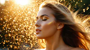 Sfeervolle beautyfotografie met gouden glitters en warme zonsondergang als achtergrond. De artistieke make-up met subtiele glitteraccenten wordt versterkt door het magische tegenlicht. perfect voor cosmetica advertenties, beauty campagnes of lifestyle content waarin glamour en natuurlijke schoonheid samenkomen.