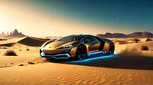 Een prachtige gouden supercar met opvallende blauwe neonverlichting rijdt door een uitgestrekte woestijn met goudkleurige zandduinen. De warme zonsondergangshemel en rotsformaties op de achtergrond creëren een adembenemend sciencefiction tafereel.
