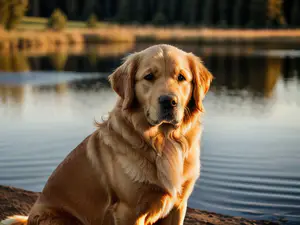 Sfeervolle foto van een Golden Retriever in warm avondlicht bij een rustig meer. De zachte gouden vacht van de hond wordt prachtig belicht door de ondergaande zon, terwijl het kalme water op de achtergrond voor een serene sfeer zorgt. perfect voor websites over huisdieren, dierenfotografie of natuurbeleving.