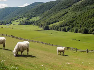 Schilderachtig berglandschap met weidse groene hellingen waar drie witte schapen rustig grazen achter een traditioneel houten hekwerk. De weelderige berghelling op de achtergrond is bedekt met donkergroene naaldbomen, terwijl de voorgrond bestaat uit een zonovergoten alpiene weide. perfect voor thema's als natuurbeleving, bergtoerisme en duurzam...